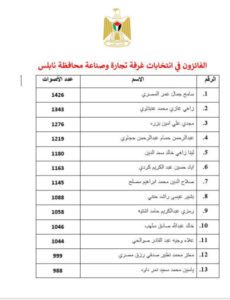 أعلنت اللجنة المركزية لإدارة انتخابات الغرف التجارية الصناعية، مساء اليوم السبت 18 فبراير 2023، أسماء الفائزين في انتخابات غرفة تجارة وصناعة محافظة نابلس .