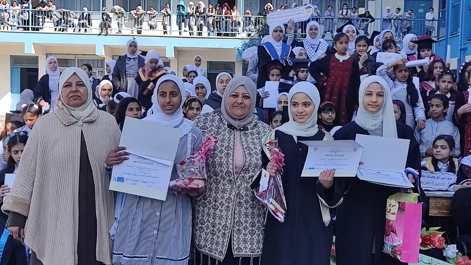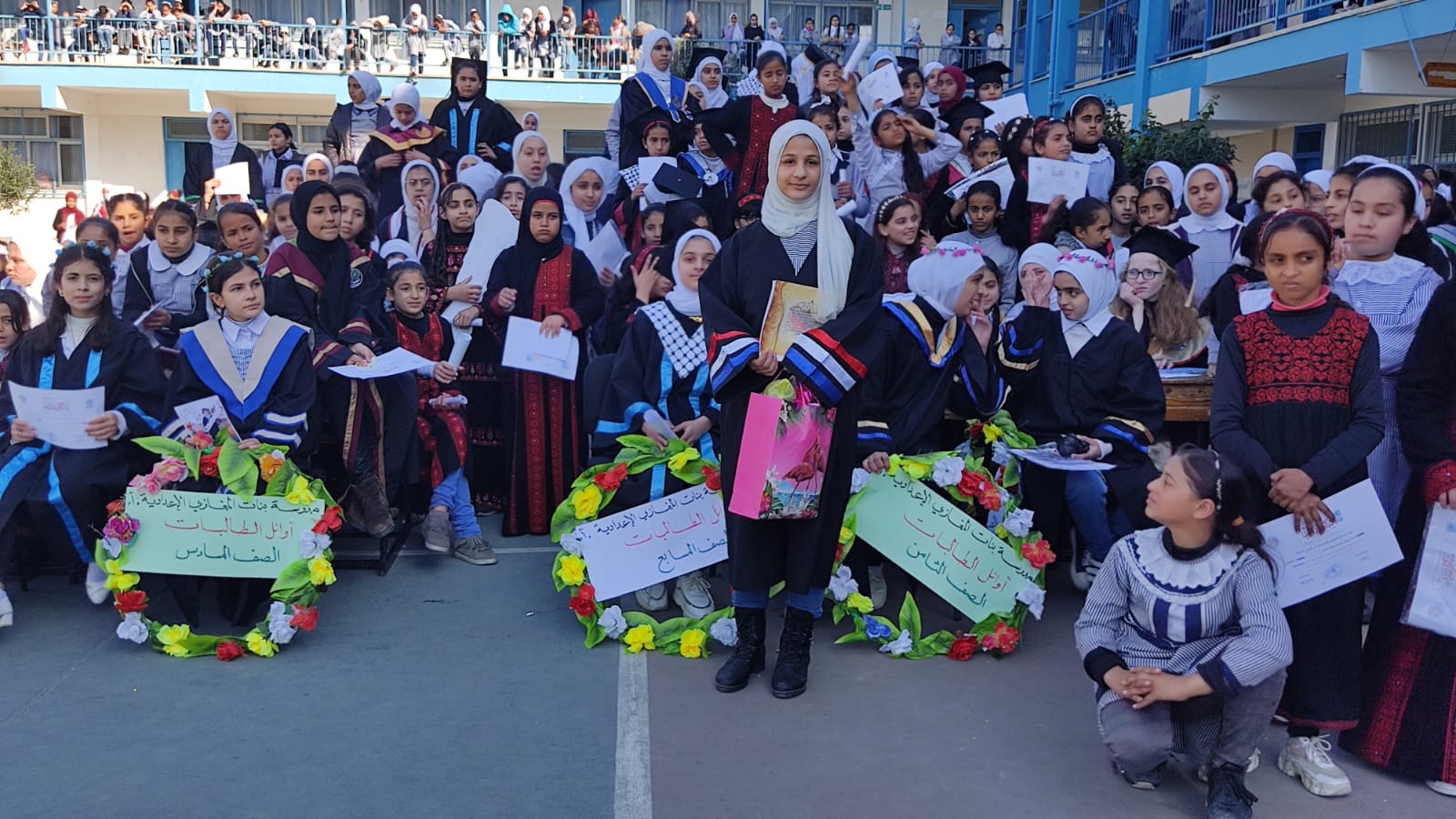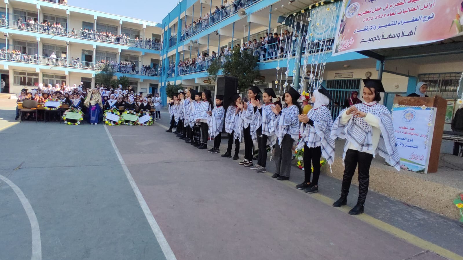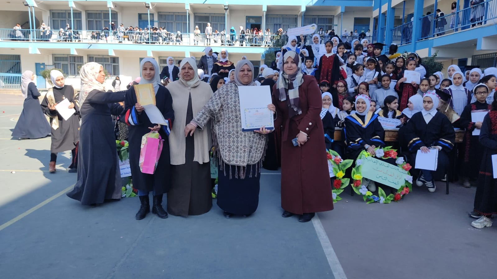 وكانت قد حصلت كذلك ثلاث طالبات من الصف التاسع من المدرسة في العام الماضي على المرتبة الأولى على مستوى القطاع بمعد100%.