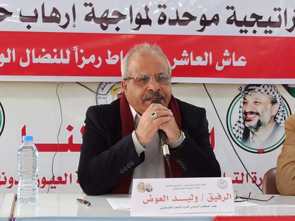 اما عضو المكتب السياسي للحزب وليد العوض فقد اسهب في مقدمة حديثه بذكر محطات مضيئة من تاريخ الحزب قدم الحزب خلالها الشهداء والضحايا وزج رفاقه في السجون وطوردوا وشردوا ولكن استمروا طوال الوقت وفي أحلك الظروف بالدفاع عن شعبهم ومن اجل مستقبل حر وسعيد له.وان السعي لتحقيق الاسترتيجية السياسية الموحدة يجب ان تستند علي اسس واضحة واولها ان العلاقة التي تربطنا بالاحتلال هي علاقة قائمة علي الصراع بمضمونه الوطني وان يتعزز هذا النضال الوطني بتعزيز المقاومة الشعبية وتقويتها وتنفيذ قرارات المجلسين الوطني والمركزي لمنظمة التحرير.