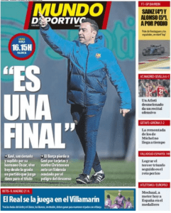 وعلقت صحيفة “موندو ديبورتيفو”الكتالونية، على مباراة برشلونة وفالنسيا قائله “إنه نهائي”، وإهتمت بمباراة الريال ضد بيتيس بعنوان جانبي: “ريال مدريد يلعب في فيلامارين بعد الشكوك التي خلفتها المباريات أمام أتلتيكو مدريد وبرشلونة ودون مودريتش”.
