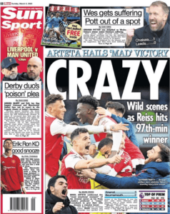 فيما اهتمت صحيفة “ذا صن” البريطانية بفوز أرسنال القاتل على بورنموث 3-2 فى الجولة الـ 26 من مسابقة البريميرليج تحت عنوان “جنون، احتفل أرتيتا بأكثر اللحظات عاطفية فى مسيرته مع أرسنال”.