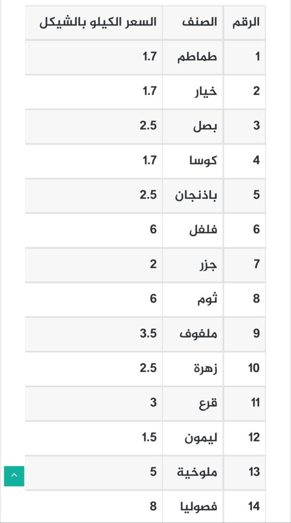 أخــبـــــار, محليقائمة أسعار الخضروات والدجاج والبيض في أسواق غزة Posted on مارس 6, 2023مارس 6, 2023 by M 06 مارس غزة – المواطن جاءت أسعار الخضروات والدجاج واللحوم والبيض في أسواق قطاع غزة، اليوم الاثنين 6 مارس 2023، على النحو التالي: – M الأرصاد تكشف تفاصيل حالة الطقس اليوم الإثنين بينهم قيادي بالجهاد وأسير محرر.. الاحتلال يشن حملة اعتقالات بالضفة والقدس