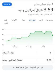 وسجل سعر صرف الدولار قبل قليل حسب الشاشة 3.59 شيكلاً إسرائيلياً جديداً بعد أن بلع سعره في الصباح الباكر 3.67 شيكلاً.