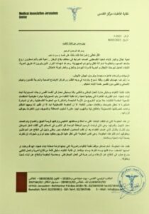وشدّدت على أن: “نقابة الأطباء ستبقى إلى جانب المواطن الفلسطيني وأمنه الصحي وحقه بالعلاج”.