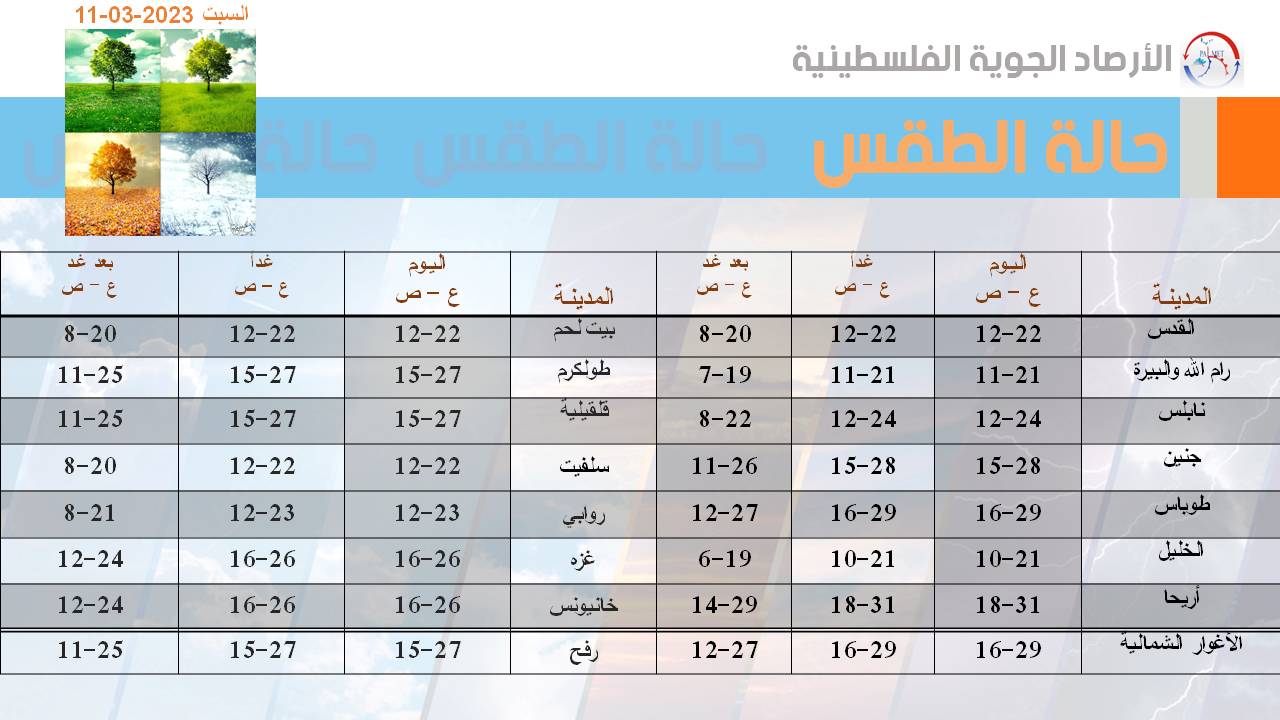 وأشار طقس فلسطين إلى أن الرياح تكون جنوبية شرقية إلى جنوبية غربية خفيفة إلى معتدلة السرعة والبحر خفيف ارتفاع الموج.