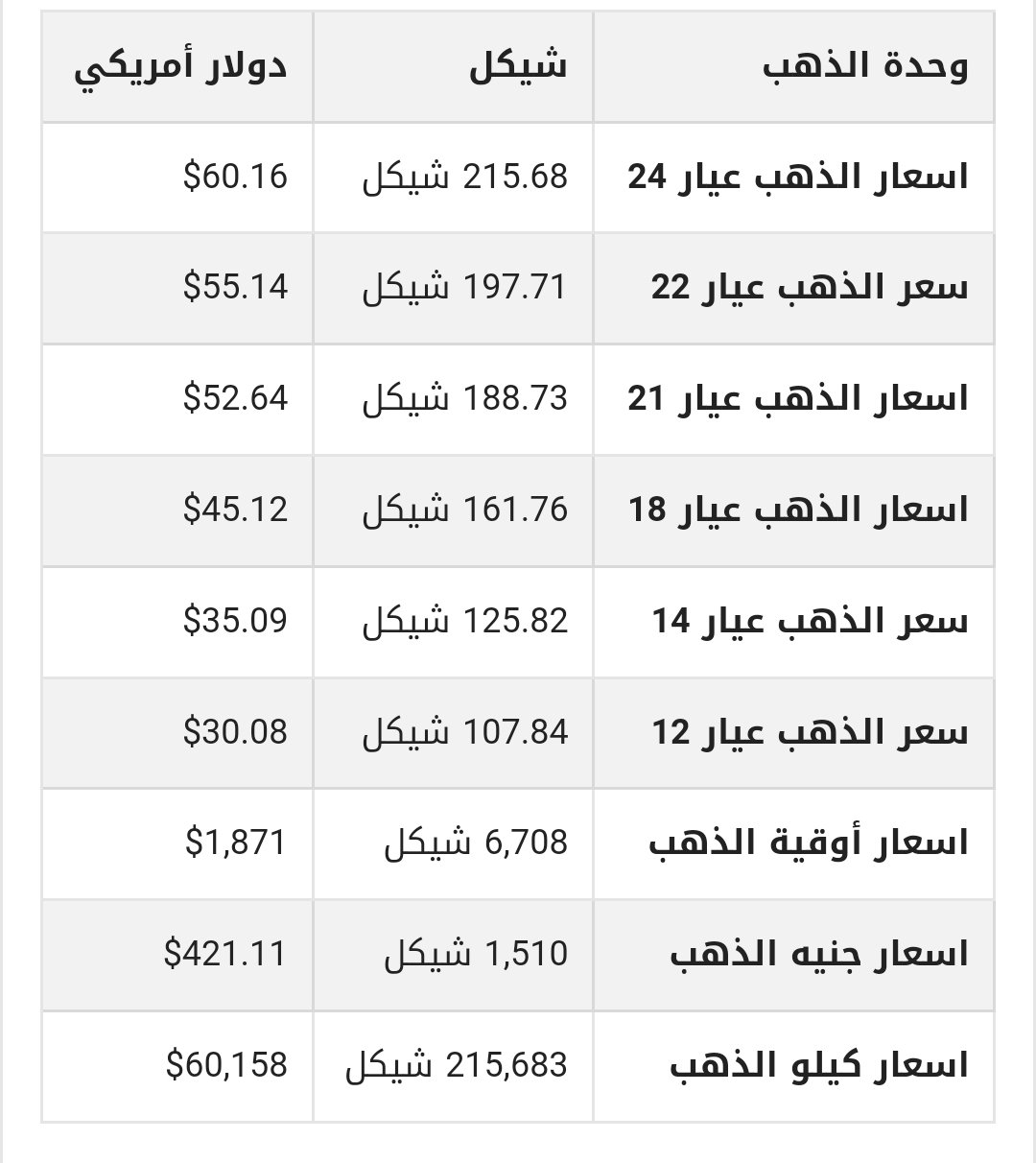 جاءت أسعار جرام الذهب عيار 21 و24 و18 في أسواق فلسطين، اليوم السبت 11 مارس 2023، وفقًا للشيكل “الإسرائيلي” والدولار الأمريكي، على النحو التالي: –