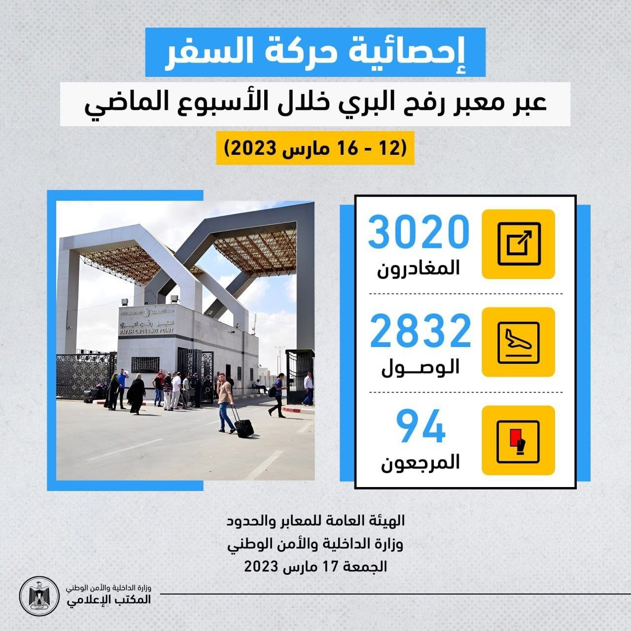 نشرت الهيئة العامة للمعابر والحدود بوزارة الداخلية في غزة ، اليوم الجمعة 17 مارس 2023، إحصائية عمل معبر رفح خلال الأسبوع الماضي 12 – 16 مارس 2023.