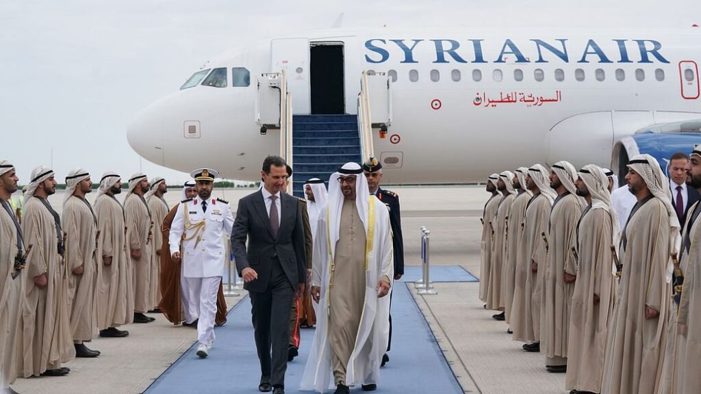 ورافقت طائرة الرئيس السوري لدى دخولها أجواء دولة الإمارات عدة طائرات حربية “ترحيباً بزيارته”.
