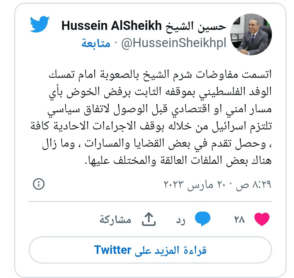 وقال الشيخ في تغريدة عبر تويتر حول اجتماع شرم الشيخ :”اتسمت مفاوضات شرم الشيخ بالصعوبة امام تمسك الوفد الفلسطيني بموقفه الثابت برفض الخوض بأي مسار امني او اقتصادي قبل الوصول لاتفاق سياسي تلتزم اسرائيل من خلاله بوقف الاجراءات الاحادية كافة”.