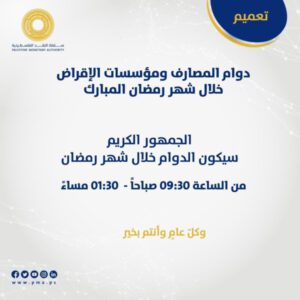 أعلنت سلطة النقد، مساء اليوم الأربعاء، دوام المصارف ومؤسسات الإقراض خلال شهر رمضان المبارك.