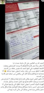 كانت أميمة بدري، قد نشرت صورا لتقاريرها الطبية عبر فيسبوك وعلقت عليها: “الحمد لله رب العالمين علي كل حاجة حصلت ليا، أنا بكتب وانا مش قادرة لاطمنكم أنا روحت المستشفى، وعملت الأشعة المقطعية علي المخ، الحمد لله مفيش جلطة، بس للأسف فقدت النطق، بسبب إني زعلت جامد، ادعولي دعوة صادقة، أنا محتاجة، لدعواتكم وشكرا لكل اللي بيكلمني بس حرفيا مش قادرة من الصدمة”.