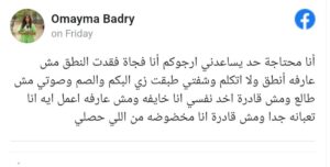 وفي تطور مفاجئ، أعلنت أميمة فقدانها للنطق، وقالت: “أنا محتاجة حد يساعدني أرجوكم، أنا فجأة فقدت النطق، مش عارفه أنطق ولا اتكلم، وشفتي طبقت زي البكم والصم وصوتي، مش طالع ومش قادرة اخد نفسي، أنا خايفة ومش عارفة أعمل ايه، أنا تعبانة جدًا ومش قادرة أنا مخضوضة من اللي حصلي”.