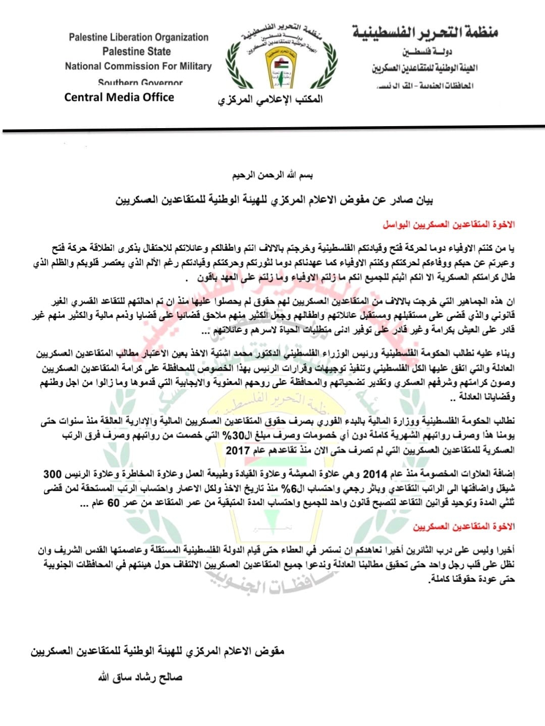 وبناء عليه نطالب الحكومة الفلسطينية ورئيس الوزراء الفلسطيني الدكتور محمد اشتية الاخذ بعين الاعتبار مطالب المتقاعدين العسكريين العادلة والتي اتفق عليها الكل الفلسطيني وتنفيذ توجيهات وقرارات الرئيس بهذا الخصوص للمحافظة على كرامة المتقاعدين العسكريين وصون كرامتهم وشرفهم العسكري وتقدير تضحياتهم والمحافظة على روحهم المعنوية والايجابية التي قدموها وما زالوا من اجل وطنهم وقضايانا العادلة ..