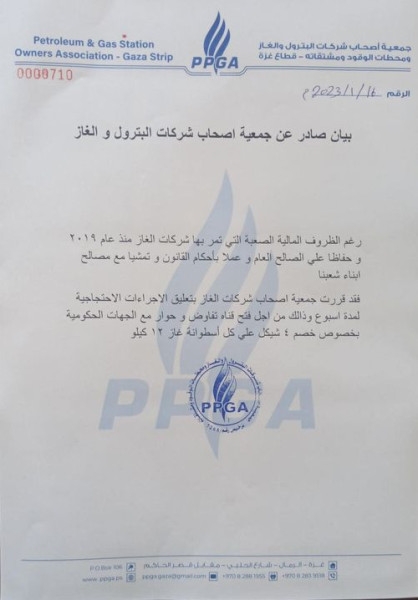 وردت جمعية أصحاب شركات البترول والغاز في قطاع غزة، على بيان وزارة المالية في غزة بخصوص سياسة التعامل المالي مع الغاز المورد للقطاع.