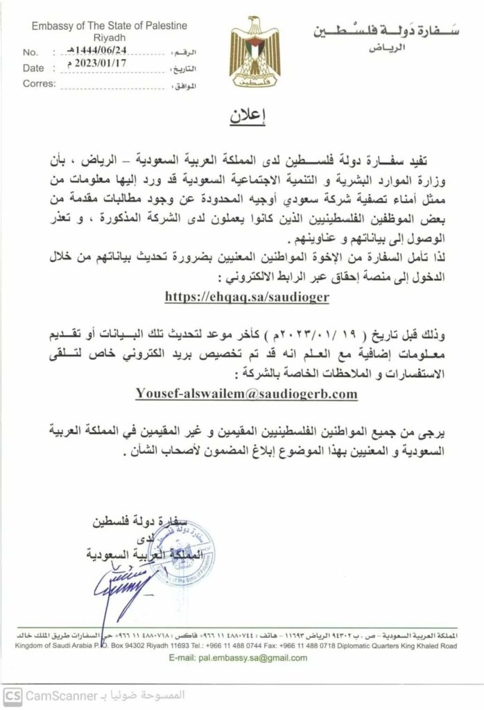 بيان هام صادر عن سفارة دولة فلسطين لدى المملكة العربية السعودية