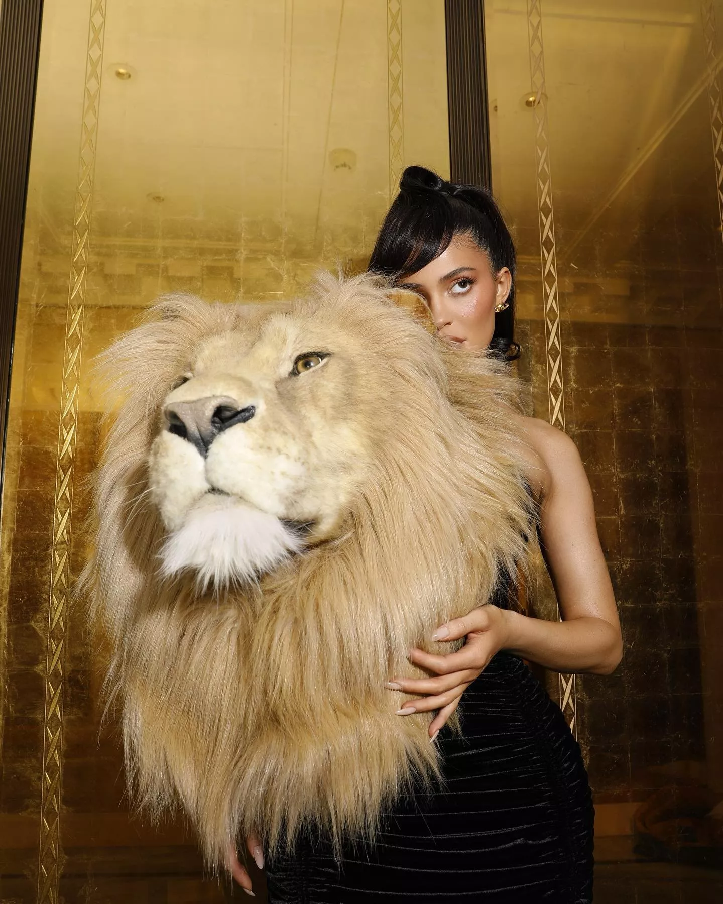 طلة Kylie Jenner كانت أكثر طلة أثارت الجدل في أسبوع الموضة الباريسي 2023. اعتمدت فستان من علامة Schiaparelli أتى بقصة الميدي وتميّز باللون الأسود. أما التفصيل المفاجئ في اللوك، فكان رأس الأسد المقترن بالفستان عند القسم العلوي والمنحوت يدوياً. يُذكر أن عارضة أزياء Schiaparelli أطلّت بالفستان نفسه على منصة العرض. جمالياً، اختارت تسريحة الشعر المرفوع، والمكياج السموكي.