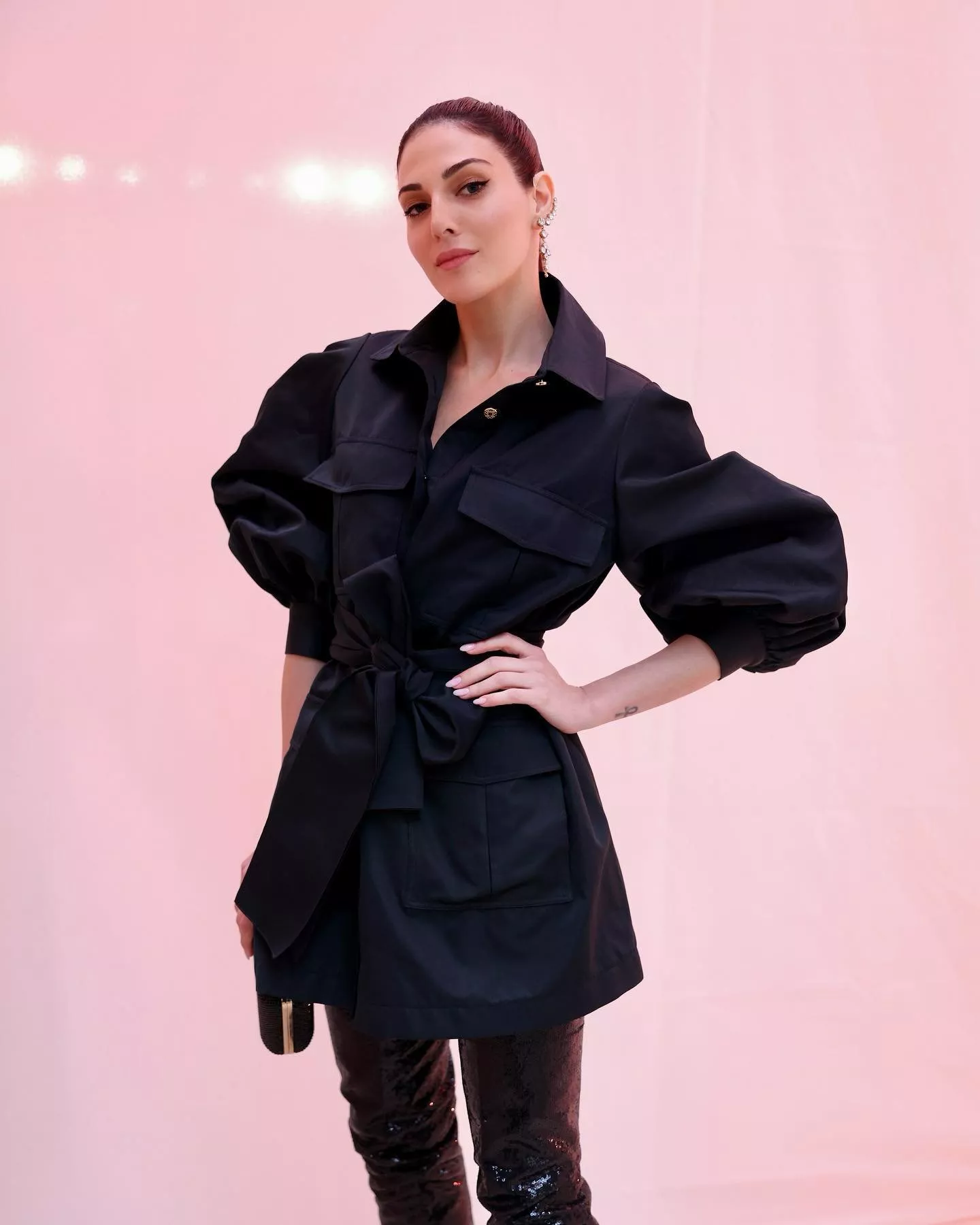 للأسف لم تتوفق بلقيس فتحي في اللوك الذي اعتمدته لعرض فالنتينو Valentino للخياطة الراقية لربيع 2023. اعتمدت تنورة لامعة باللون الفضي ونسّقتها مع توب باللون البيج، أتت بأكمام طويلة وياقة عالية، كما اقترنت بفتحة عند الظهر. تنسيق القطعتين مع بعضهما البعض لم يكن موفق، وكان باستطاعتها ارتداء تصميم يمدح جسمها أكثر. جمالياً، اختارت تسريحة الكعكة العالية والمكياج السموكي القوي.