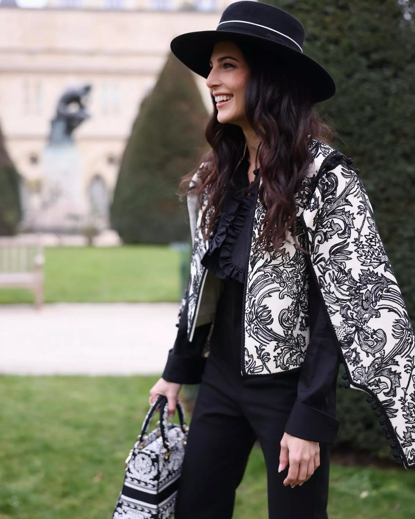 لعرض ديور Dior، اختارت رزان جمال سروال باللون الأسود، نسّقته مع قميص باللون نفسه وجاكيت متّسمة بالرسومات جمعت ما بين اللون الأبيض والأسود، جميعها من ديور Dior. أكملت إطلالتها بحقيبة يد من العلامة نفسها مزيّنة بنقشة الجاكيت ذاتها، حذاء كعب عالِ باللون الأسود وقبعة كبيرة من اللون نفسه. جمالياً، اختارت تسريحة الشعر الويفي والمكياج الناعم.