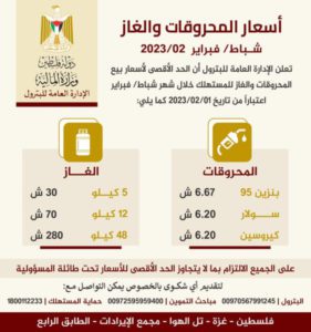 نشرت وزارة المالية، بغزة، اليوم الأربعاء، أسعار المحروقات والغاز لشهر شباط/فبراير 2023.