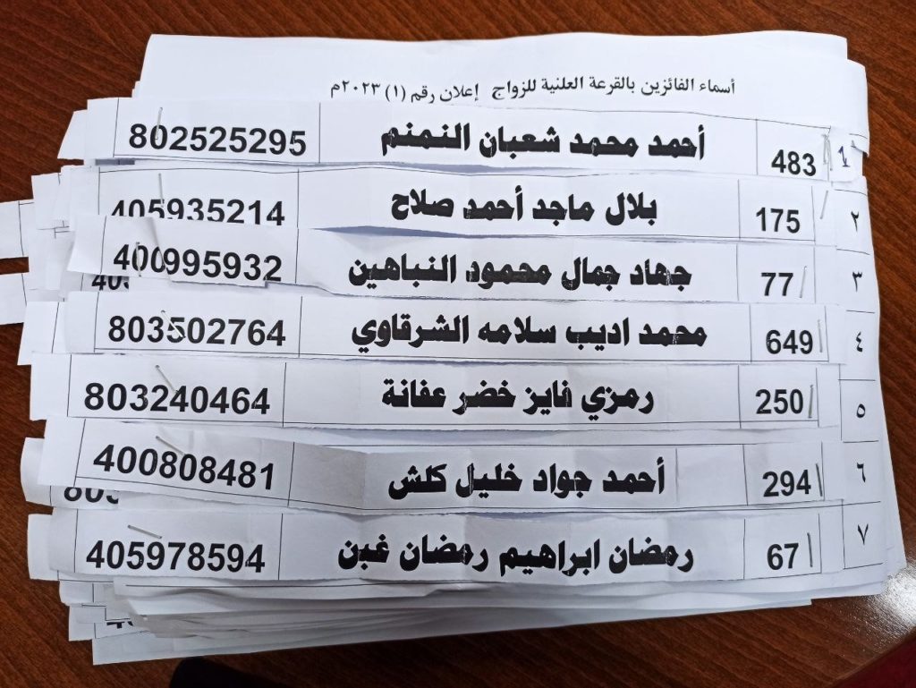 وجرى اختيار (100) شابًّا من المقبلين على الزواج من خلال نظام القرعة العلنية، بحضور القائم بأعمال رئيس الهيئة الأستاذ جمال العقيلي، ونائب رئيس مجلس إدارة صندوق دعم الشباب الفلسطيني الأستاذ أسامة بكرون، وأمين السر الأستاذة مؤمنة الرقب، وعضو مجلس الإدارة المهندس حاتم النبريص، ومدير الصندوق الأستاذ علاء الباز، ومدير عام الطفولة والطلائع الأستاذ عصام الهبيل.