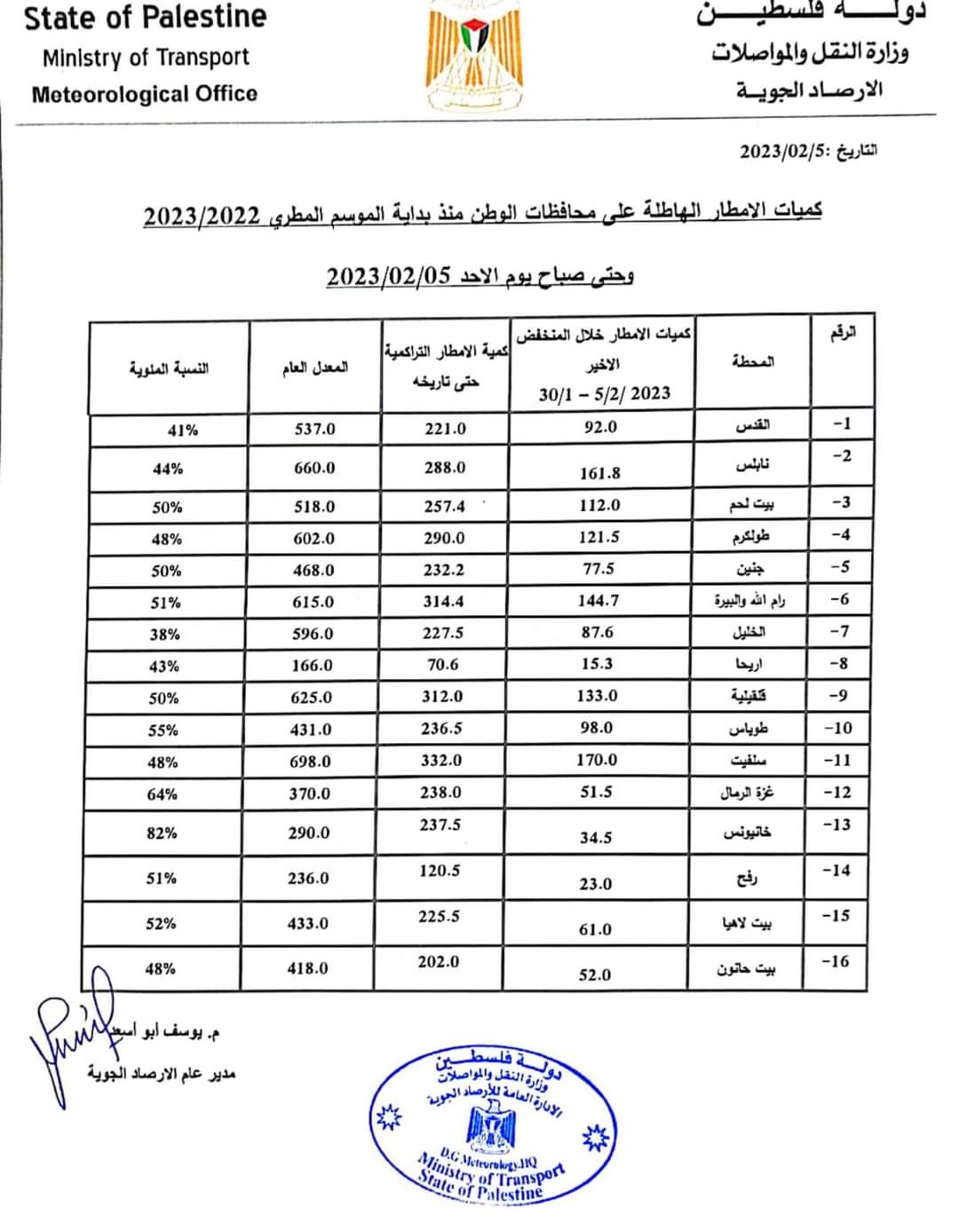 أعلنت دائرة الارصاد الجوية الفلسطينية، كميات الأمطار التي هطلت على كافة محافظات الوطن منذ بداية الموسم المطري وحتى صباح يوم الأحد 5/2)2023، بعد أن تأثرت البلاد بحالة جوية ماطرة.